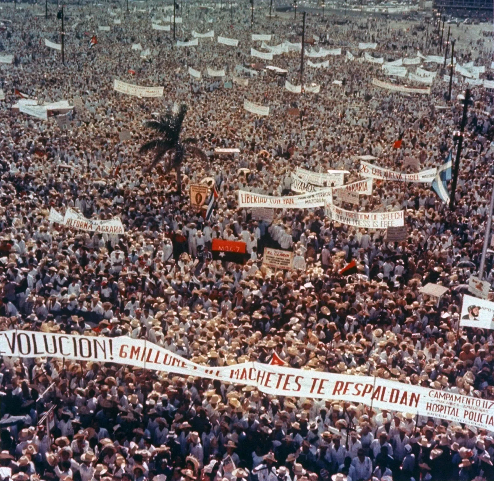 A sea of supporters fills Havana’s Plaza de la Revolución in 1959, rallying behind Fidel Castro amidst promises of agrarian reform, sovereignty, and social justice in the wake of Batista’s fall.