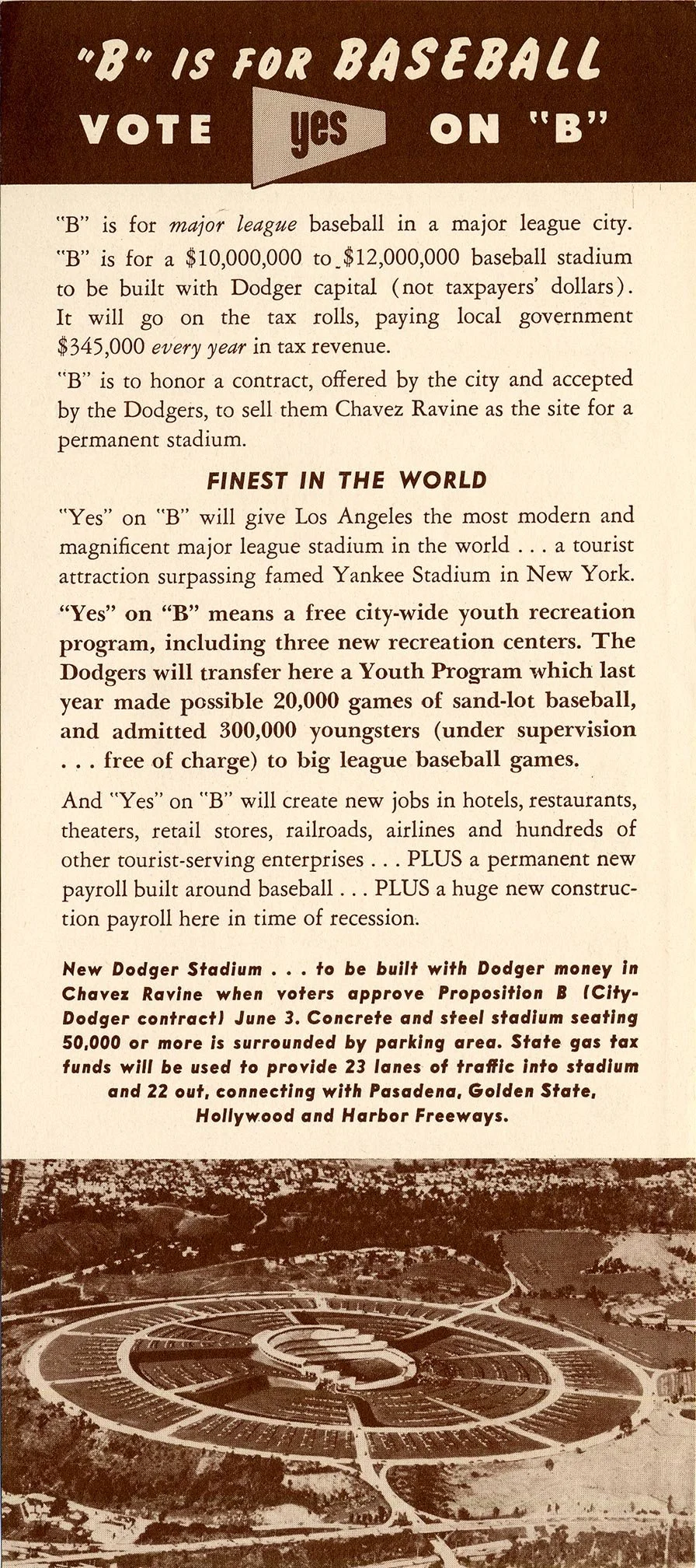 Propaganda flier for Proposition B, which would result in a victory for Dodger Stadium